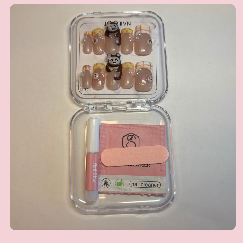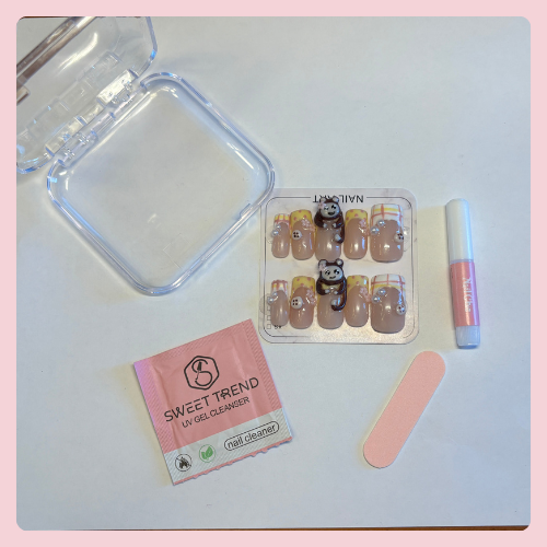 Un emballage pratique tout-en-un comprenant une lime à ongles, une lingette désinfectante et la colle — idéal à glisser dans ton sac pour toutes tes sorties.